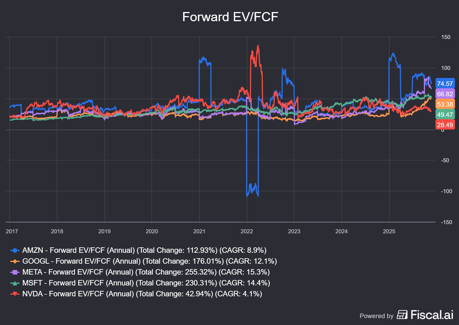 Looking at the forward EV/FCF ratio shows a more mixed picture. The insanely high CapEx is leaving its mark on the FCF. The only company with a forward EV/FCF ratio below 49 is …. NVIDIA. I guess you would not have expected this one.
