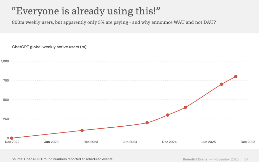 ChatGPT has 800 million global weekly users. The world has 6 billion people with internet access, and China, with 1 billion internet users, banned ChatGPT, leaving 5 billion potential users. Therefore, ChatGPT has already reached 16% of all potential users, but managed to convert only a fraction into paying users. How is this ever going to be profitable?