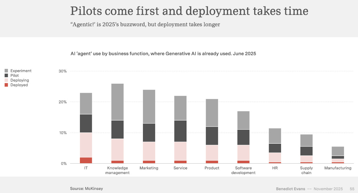 Despite all the headlines of AI taking over every kind of job and millions of jobs in danger, the rollout takes time. Only a fraction of companies have successfully implemented AI agents.