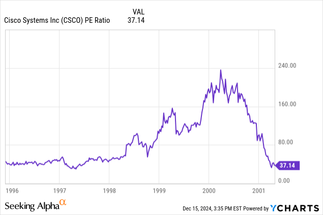If the P/E ratio falls, it is either due to a falling stock price, rising earnings, or both. In Cisco’s case, the P/E ratio dropped due to a collapsing stock price.