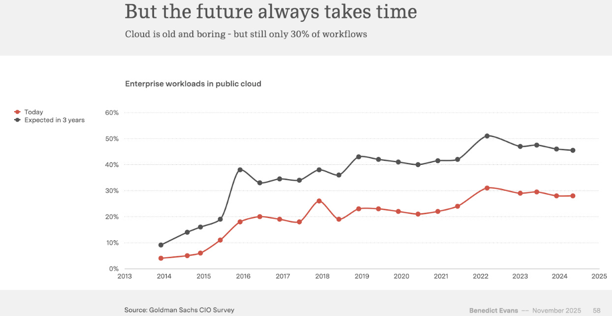 Innovation is a strange beast. It is intriguing and all-encompassing but takes its time. Cloud, which has been around for quite some time, only covers 30% of all enterprise workloads these days. AI will also take its time.