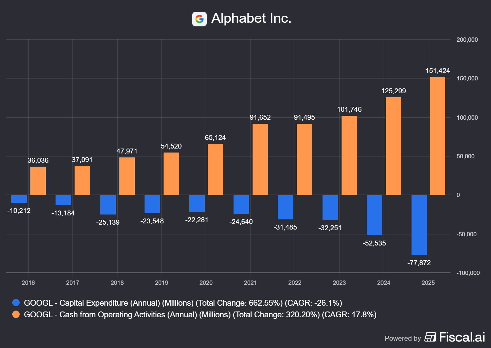 Amazon has been traditionally a very high CapEx spender. Think of all those warehouses and the AWS ramp-up. Now, only companies such as Alphabet are massively increasing their spending.