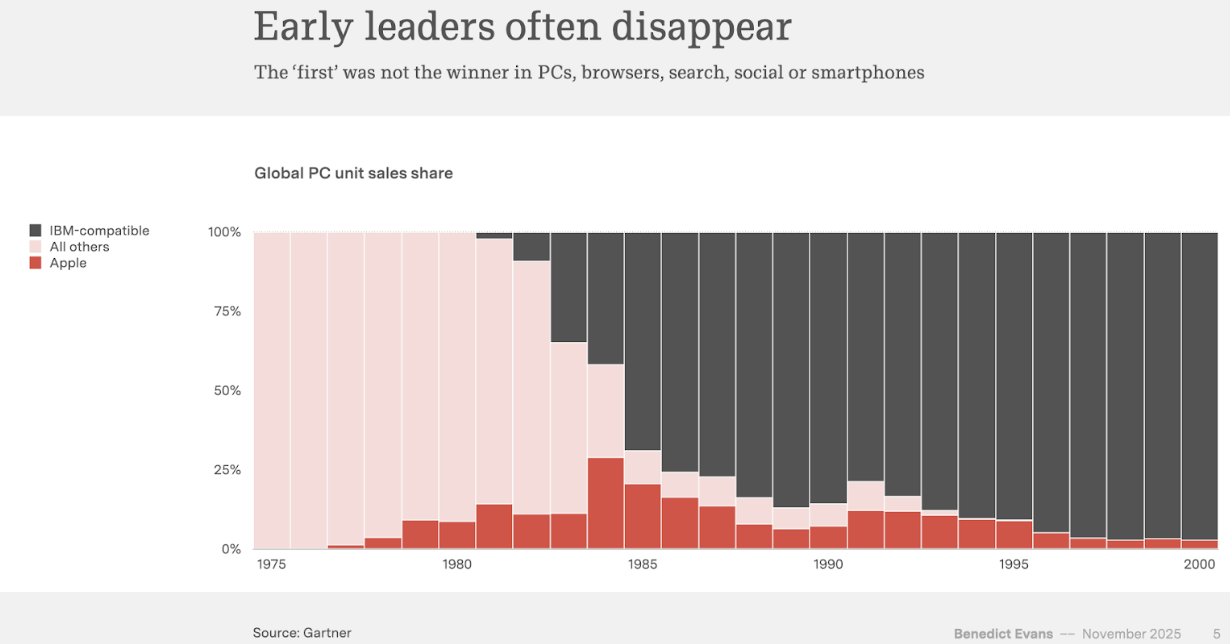 The companies leading today (OpenAI with ChatGPT, Alphabet with Gemini, etc) might not be the ones who will lead in a couple of years. Below is an example of PC unit sales; another example is the beloved Finnish company Nokia, which once seemed indestructible. And then came the smartphone…