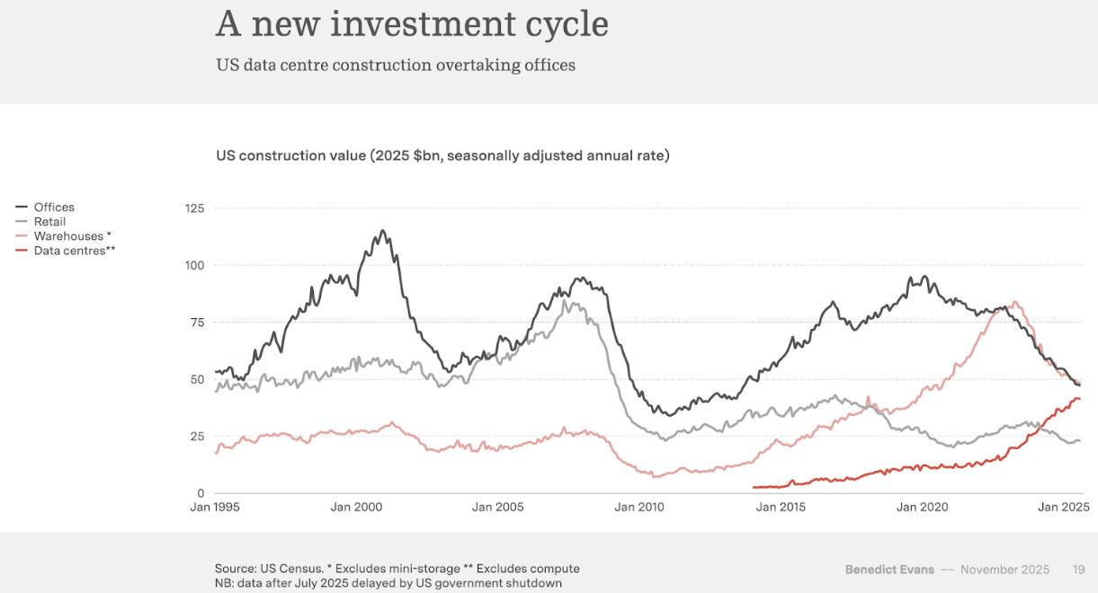 The US Data centre construction value is about to overtake the office construction value. An interesting side note: You can see nicely the housing boom from 2005-2009 until the big crash. Retail (in grey) looks like an insect pretending to be dead. That is another effect of the internet boom.