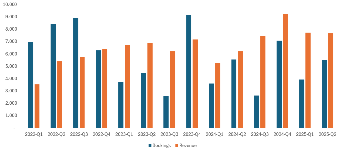 While the bookings (dark blue) have been consistently higher in 2022, the revenue has kept increasing faster than the bookings in recent quarters.