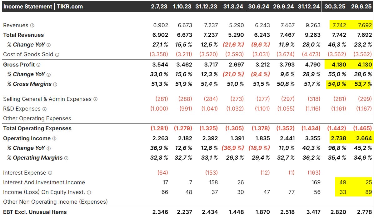 Revenue was very strong, both in Q1 and Q2 of 2025. Especially when compared with HY1 of 2024 (+34%). One high-NA system sale was recognized in Q2/25, a main driver for the strong revenue. The great thing about HY1 was the fantastic gross margins of 54% in Q1 and 53.7% in Q2. As a result of the strong revenue and the increased gross margins, the gross profit increased over-proportionally compared to HY1/24.