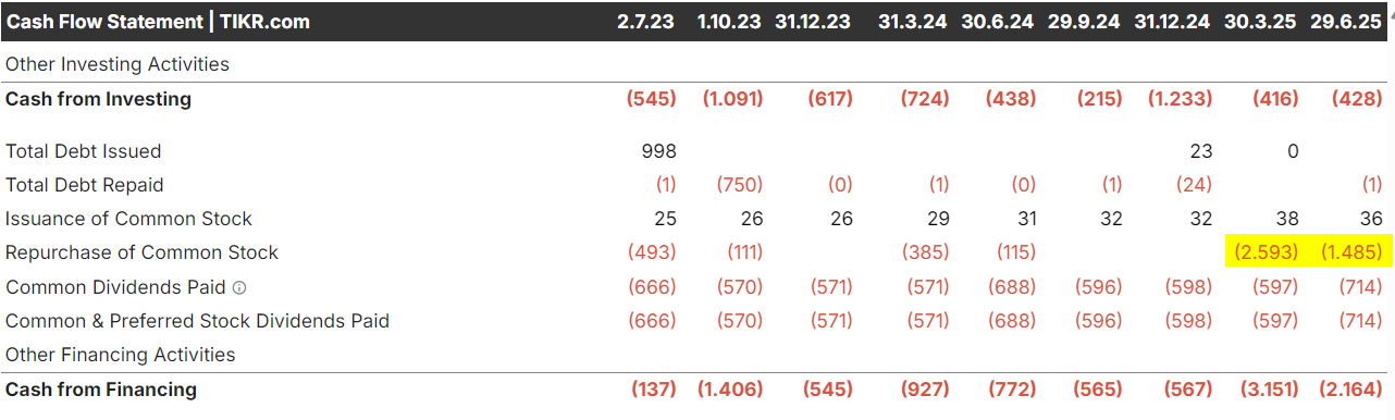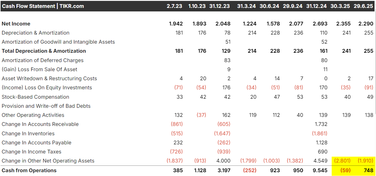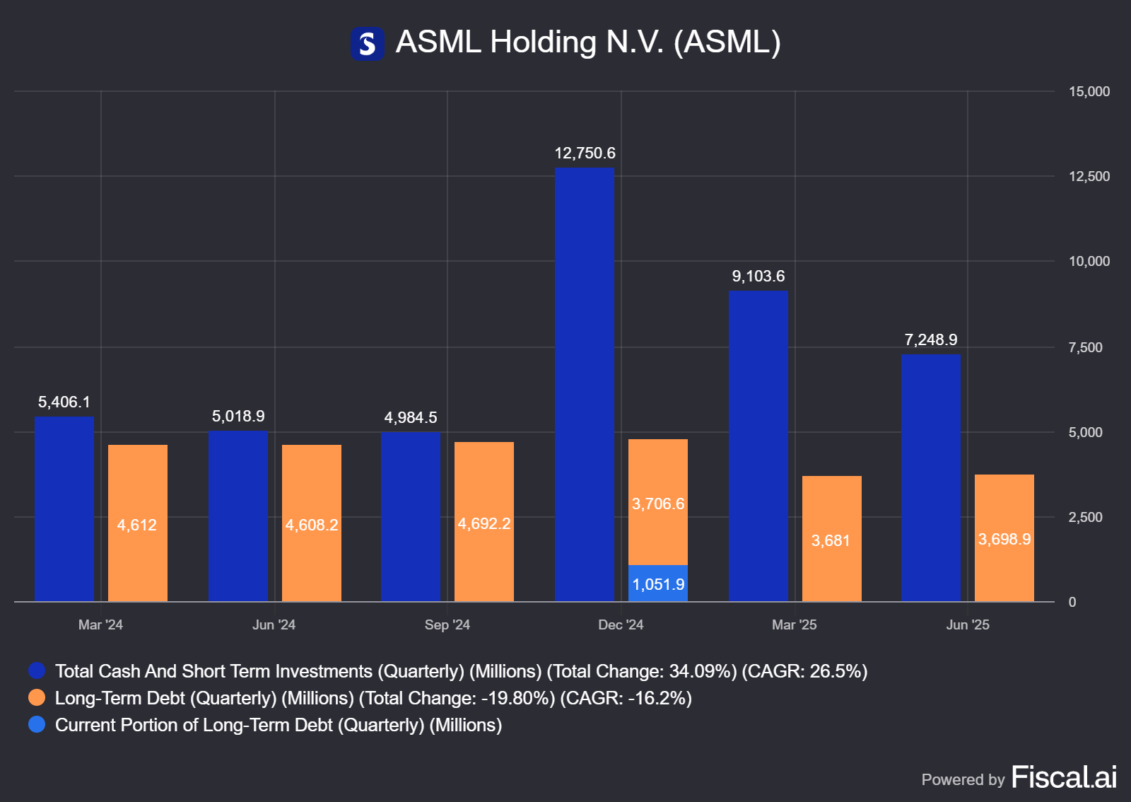 The cash from financing mirrors the previously mentioned large share buybacks of more than €4 billion in the first six months of 2025. To give you an idea of the magnitude of the buybacks: In Germany, there are just 86 companies with a market cap of more than €4 billion. ASML also continues its dividend policy and paid out a generous €714 million in Q2/2025 alone.