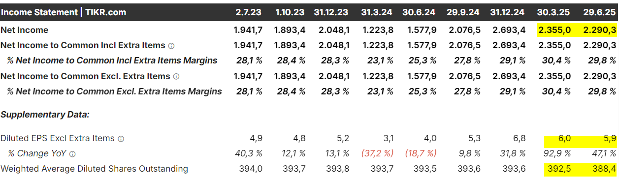 Net income in Q1/25 almost doubled from Q1/24, and Q2 was way above the previous year’s result. Because ASML keeps buying back shares, the number of outstanding shares keeps dropping and boosts the earnings per share even further.