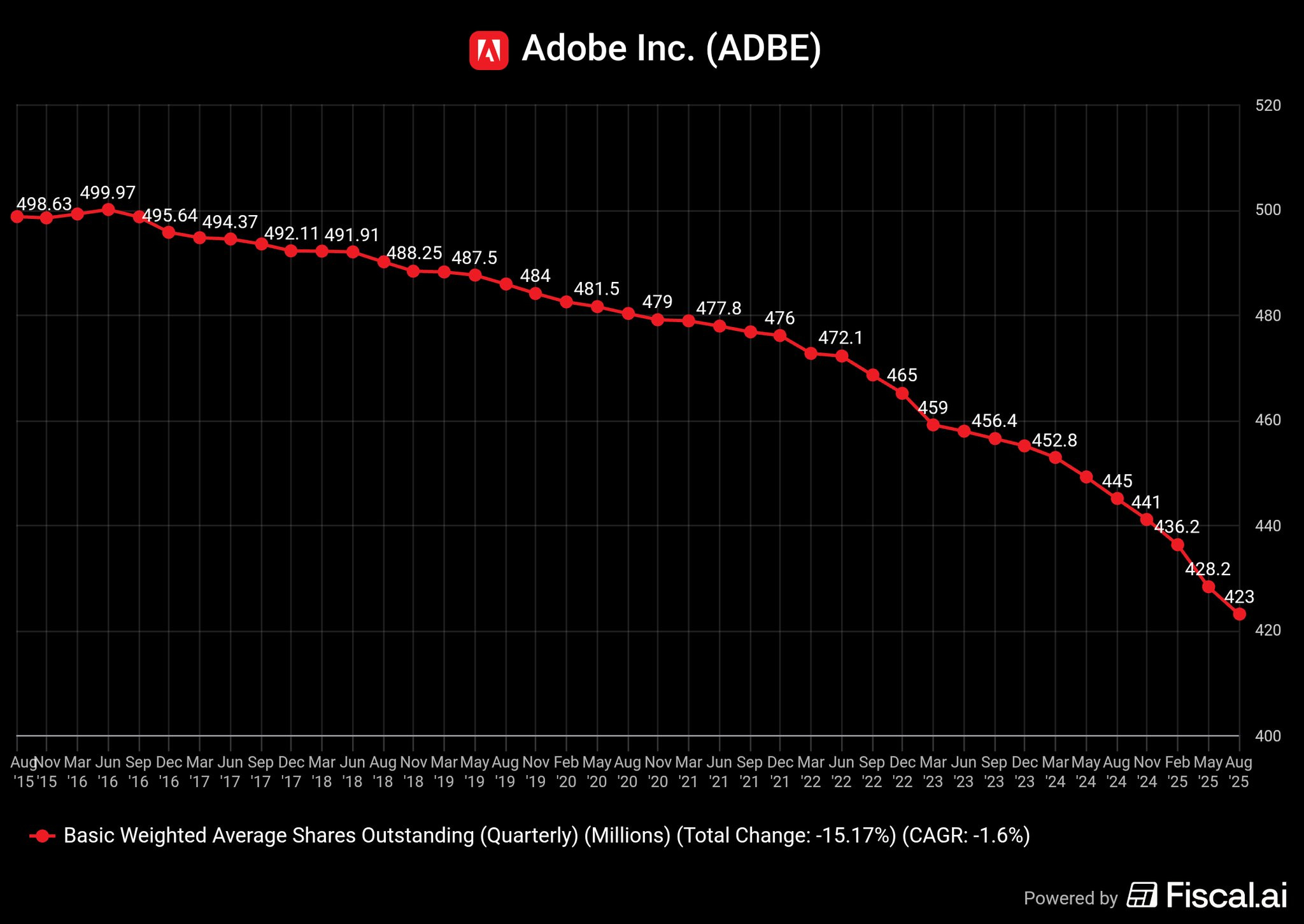 Adobe released its Q3/2025 numbers yesterday, and these numbers were strong. The management slightly raised the EPS guidance for the whole year and did monster buybacks yet again. The number of outstanding shares decreased by 5.3% versus the previous year. Purely by holding your shares, your total ownership of the company increases. That’s a lovely setup.
