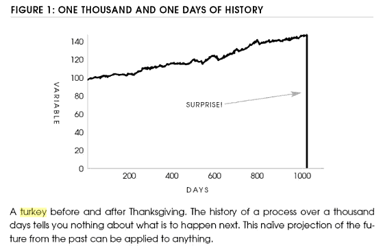 “Consider a turkey that is fed every day. Every single feeding will firm up the bird’s belief that it is the general rule of life to be fed every day by friendly members of the human race “looking out for its best interests,” as a politician would say. On the afternoon of the Wednesday before Thanksgiving, something unexpected will happen to the turkey. It will incur a revision of belief.”