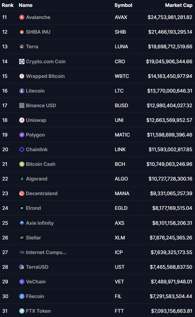 What I can tell you: A lot of those coins and tokens that are hyped right now will fade and reach their inherent value: $0. This is a snapshot of the largest crypto coins and tokens from November 2021, when I was active. These are ranked by marketcap and show #11 to #31.