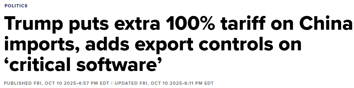 Coming back to this eventful Friday: Stocks at an ATH, Bitcoin close to its ATH of $125,000, and the markets are ripe for a correction. Sooner or later, every market needs a correction, and usually the explanation is found after the event. The stock and crypto markets are some of these bizarre animals where the event happens first and then the story is created. In this case, it was Monsieur Trump with a new round of tariff escalation pointed at China.