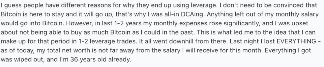 A lot of traders woke up feeling like a Turkey on Friday. The role of leverage in crypto tends to be a lot higher than in other markets. If you are 2x leveraged in Bitcoin and you hold $1000 worth of Bitcoin, it means that you now control $2000 worth of Bitcoin. This is all fun as long as the markets, or in this case Bitcoin, go up, since you double your gains. Since all coins have a flipside, leverage has a nasty one, too. My hero Charlie Munger had it right, as usual: