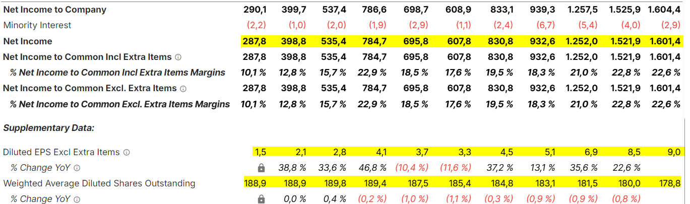The net income increased substantially as well. Through sharebuybacks the number of outstanding shares decreased slightly in the last few years, and as a result, the earnings per share increased from €1.5 in 2015 to €9.0 in the last twelve months.
