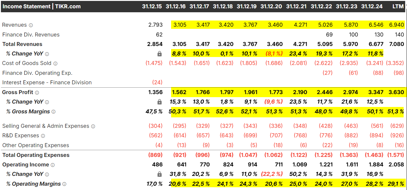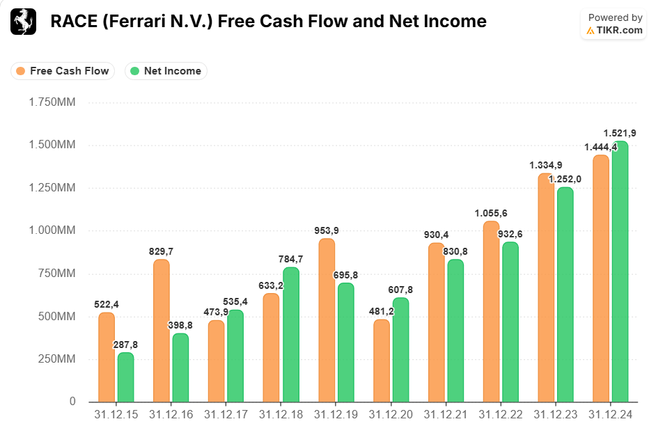 The income statement tells the same story. Revenue more than doubled in the last 10 years. The gross margin is pretty consistent at 50%. Ferrari sold just 13,752 cars in 2024 for an average price of roughly €400k. I arrived at the number by dividing the revenue from cars and spareparts by the number of cars sold. Ferrari also has some sponsorship, commercial, and brand income, as well as a financing division. At the same time, the production costs are just about half of that. Each car sold means that Ferrari makes about €200k profit.