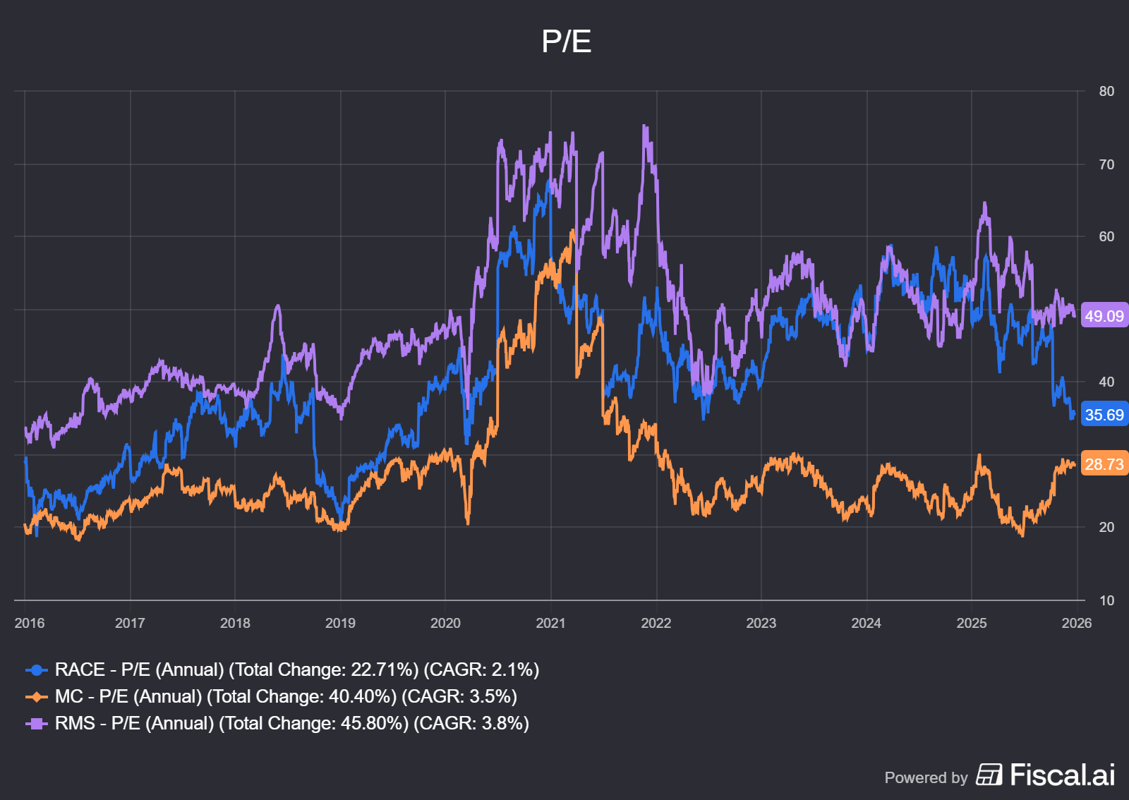 Ferrari is not a traditional car maker, but rather a producer of luxury goods like LVMH or Hermès. Just like the other two, Ferrari’s P/E ratio was very high in recent years.