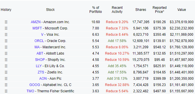 Quite a large portfolio and here are the top positions. Compared to the fellow above, Polen Capital is on fire and always trims and adds to its positions. The largest changes in Q1 were a strong increase in the Aon position and large reductions in Netflix, Apple, Alphabet, and ServiceNow. Starbucks entered the portfolio as a brand new position.