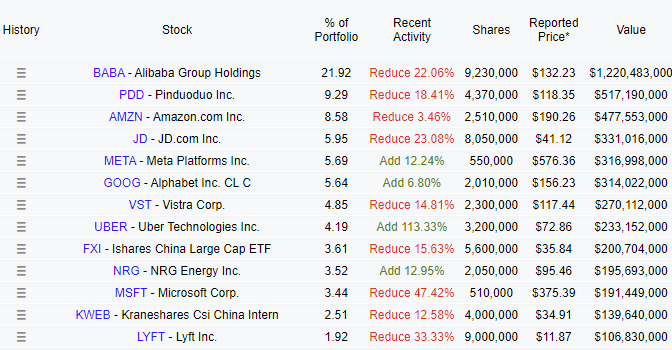 David Tepper is one of the top fund managers with the largest China exposure. Three of his top four positions are Chinese tech companies. Pinduoduo is the holding company of the infamous Temu. Even though he trimmed Alibaba by 1/5, it is still by far his largest position. Similar to Bill Ackman, David Tepper added to Uber.