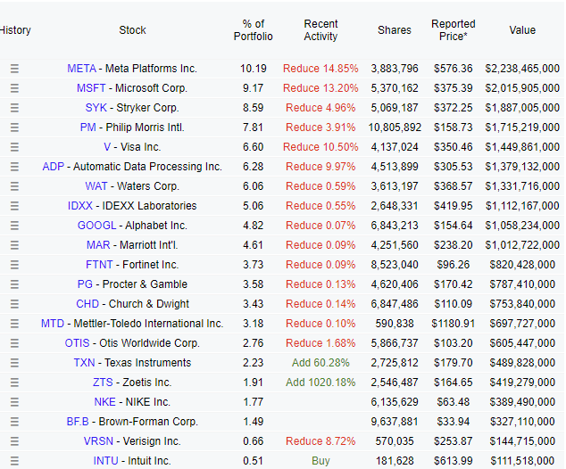 Terry Smith has a broadly diversified portfolio and is not as concentrated as Alta Rock Partners or Valleyforge. Due to this fact, there are a lot of small changes. Terry Smith was busier than usual and sold his entire PepsiCo position, which previously made up 3.7% of the total portfolio. Other noteworthy changes include reductions in Meta and Microsoft and a strong addition to the Zoetis position.