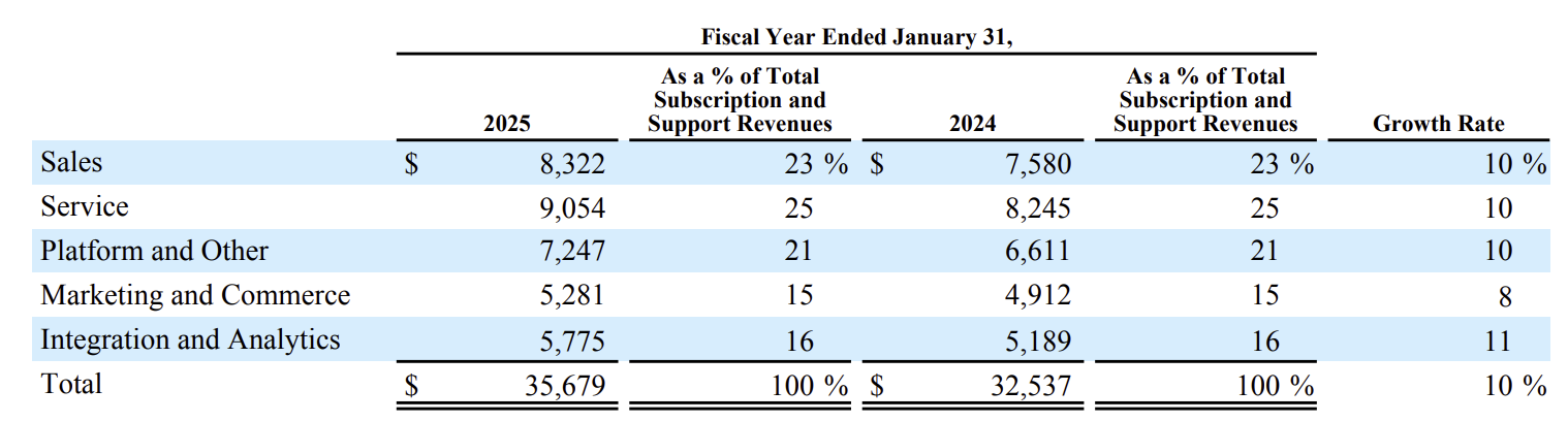 Salesforce clusters its offering into these categories: Sales, Service, Platform, and Others, Marketing and Commerce, Integration and Analytics, and Others. Salesforce makes 94% of its revenue from subscription and support revenues. Service has become Salesforce's largest category, and apart from Marketing and Commerce, all offerings grew double digits.