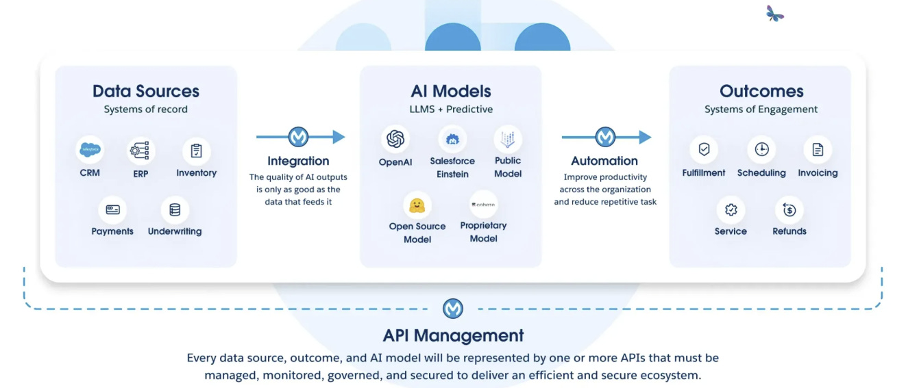 Integration is done by MuleSoft. MuleSoft was acquired in 2018 for $6.5 billion. MuleSoft offers integration, automation, and API management and is used by customers ot connect data across different systems, automate tasks across systems, and scale API governance.