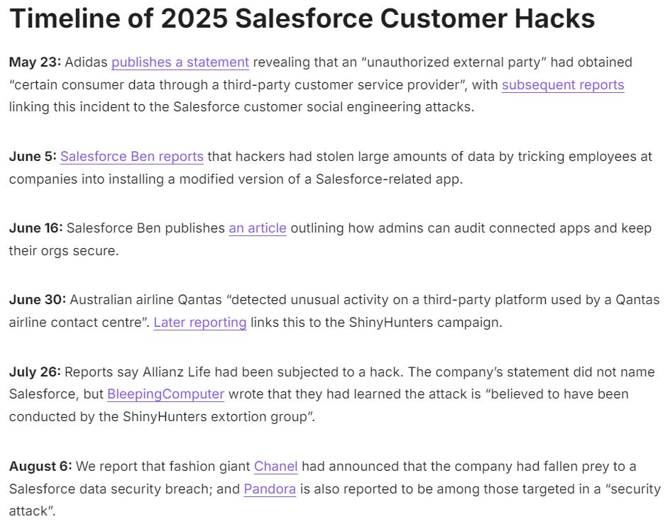 In my opinion, it is not a matter of if, but when there will be a major data leak of customer information. These hacks can be facilitated by either directly targeting the Salesforce database or through social engineering. In this case, employees of a company are being tricked into giving access to the program or divulging confidential information. The following is a list from the website SalesforceBen of the most recent hacks.