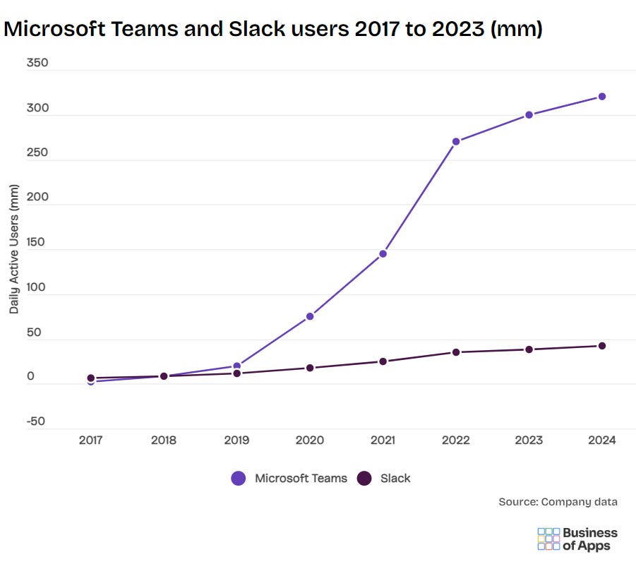Slack has a longer history than Teams, but distribution is sometimes all that matters. Since Teams was originally offered free of charge if you already had a Microsoft Office subscription, the daily active users went ballistic when COVID hit.