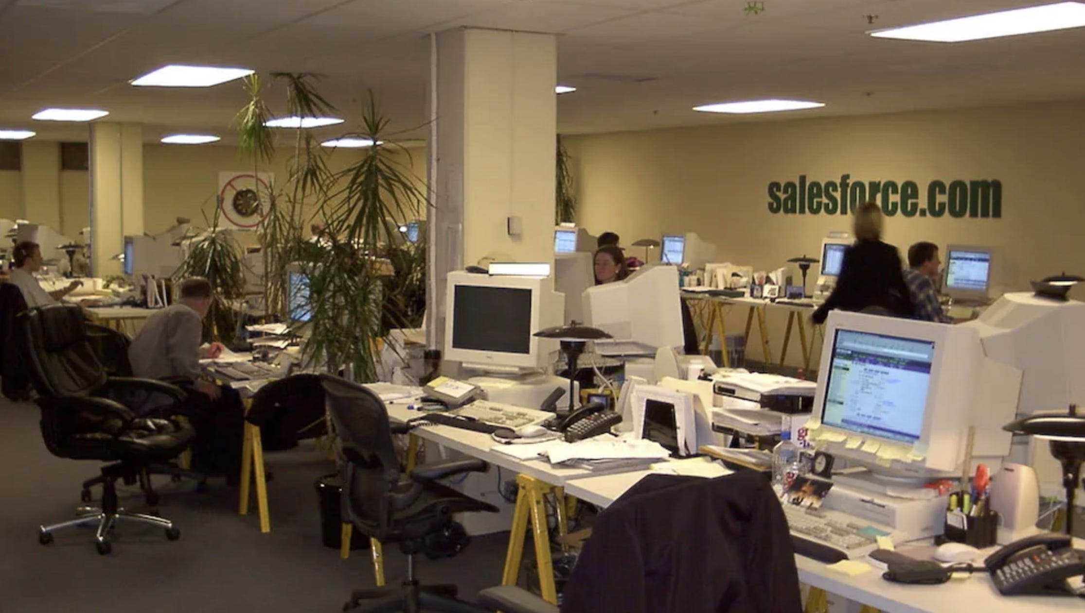 Salesforce was founded in 1999, just before the dot-com bubble burst, by Marc Benioff, and went public in 2004 at a stock-split-adjusted price of $2.75 a share, with just 518 employees. The office gives me some early Amazon vibes.